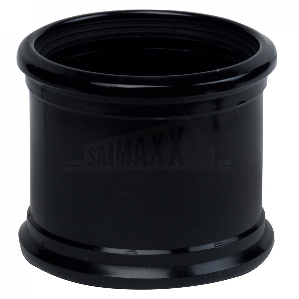 A 110mm pushfit black coupling joins two 110mm drainage pipes in a straight run. It provides a secure push-fit connection for above-ground waste and soil systems.