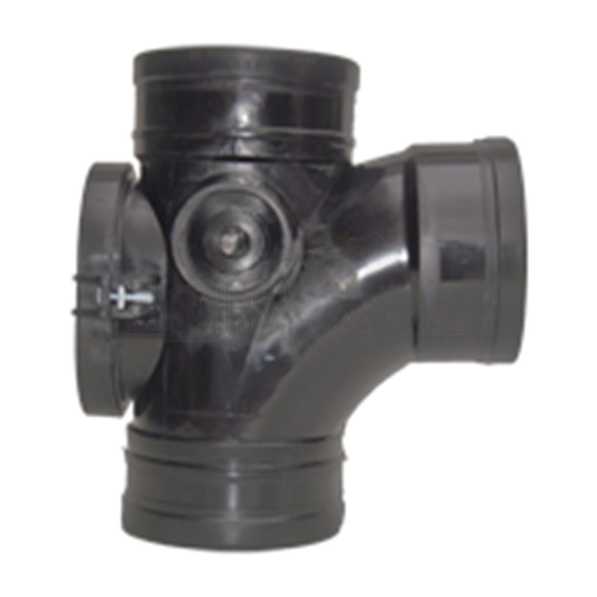 A 110mm solvent black 92.5 degree access tee with triple socket connections forms a branch in a soil or waste system and includes access for inspection or clearing blockages. It is designed for solvent-weld above-ground drainage pipework.