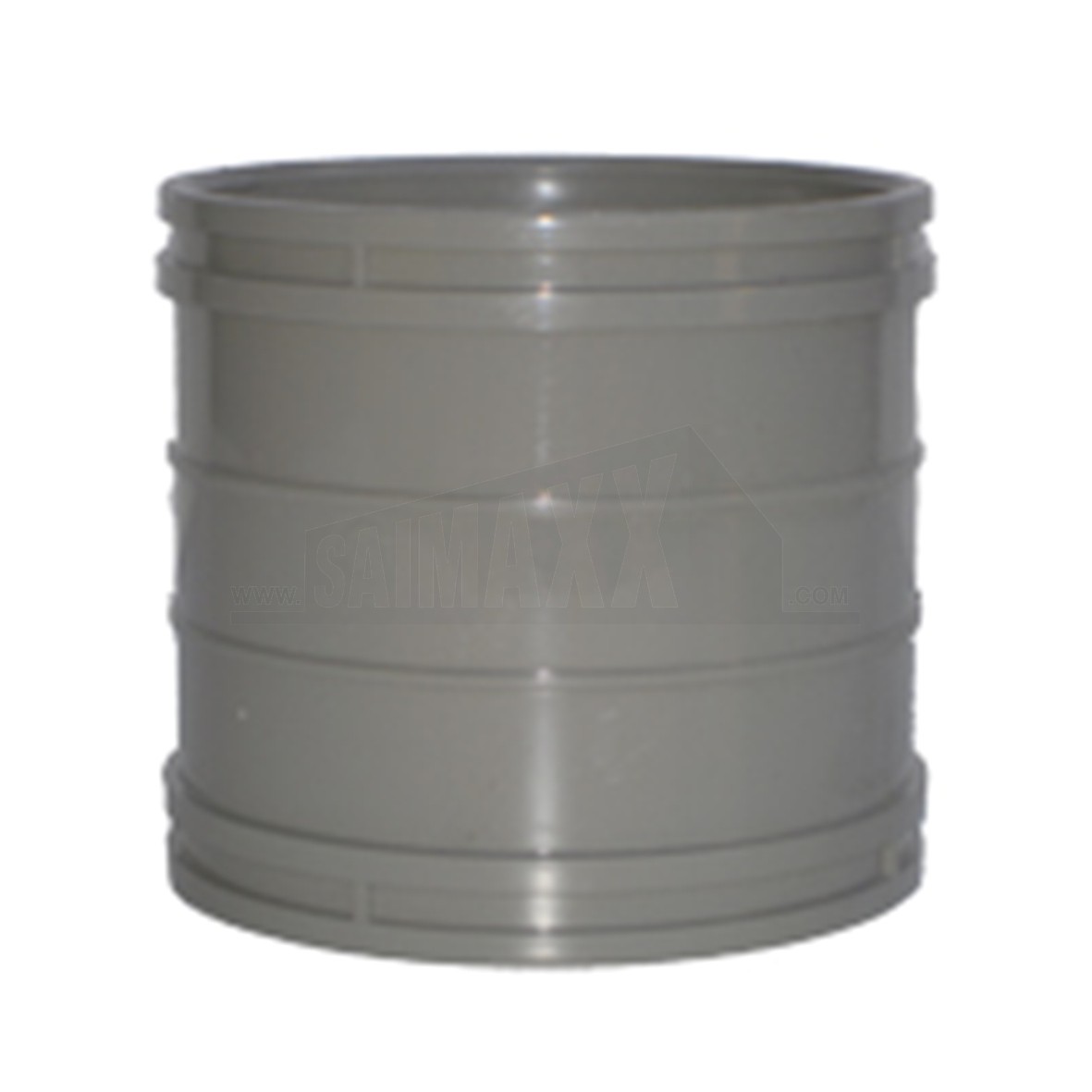 A 110mm solvent grey coupling straight joint connects two lengths of 110mm soil pipe in a straight run. It provides a secure solvent weld joint for above-ground soil and waste systems.