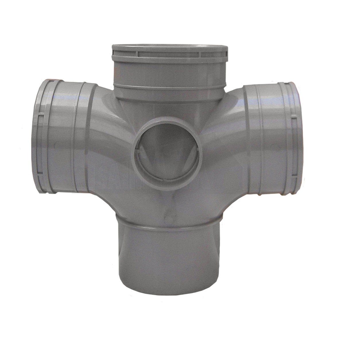 A 110mm solvent grey double branch 4 way tee with a 92.5 degree branch angle and triple socket connections for underground drainage systems. It joins multiple 110mm pipes in a solvent weld system where several branch connections are required.