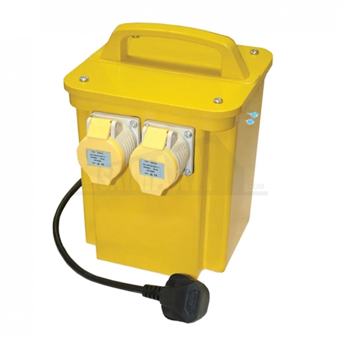 A 110V 3.3kVA yellow powertool transformer with 2 x 16A socket outlets is designed to supply reduced low-voltage power safely on site. It converts mains power for temporary use with 110V tools and equipment in construction and workshop environments.