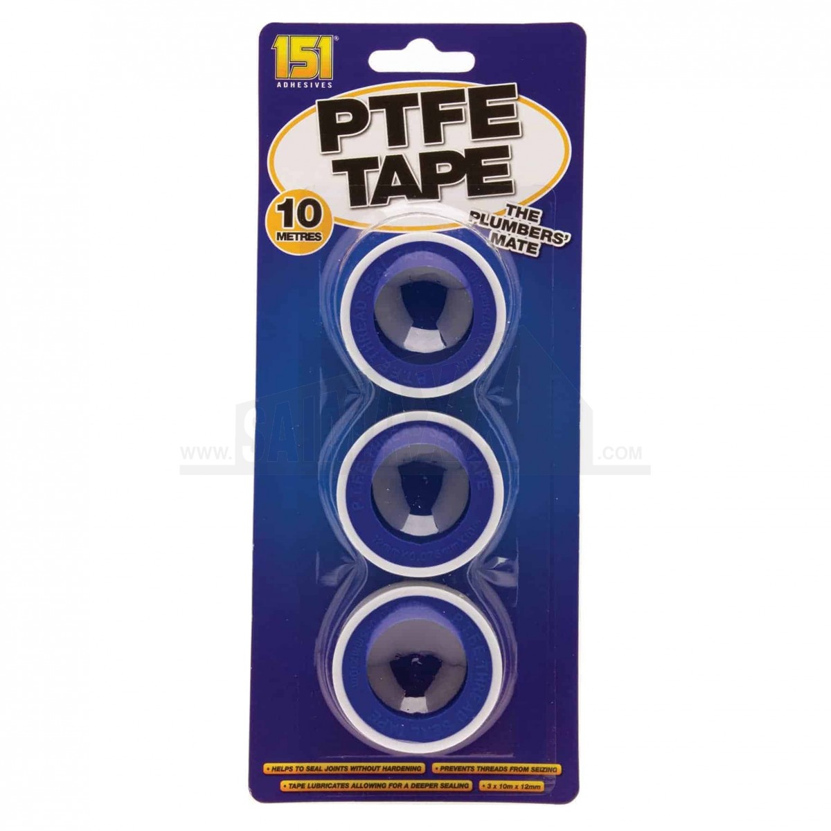 A pack of 151 PTFE tape rolls includes three 10m x 12mm rolls for sealing threaded pipe joints and fittings. It helps create a watertight seal on screwed plumbing connections.
