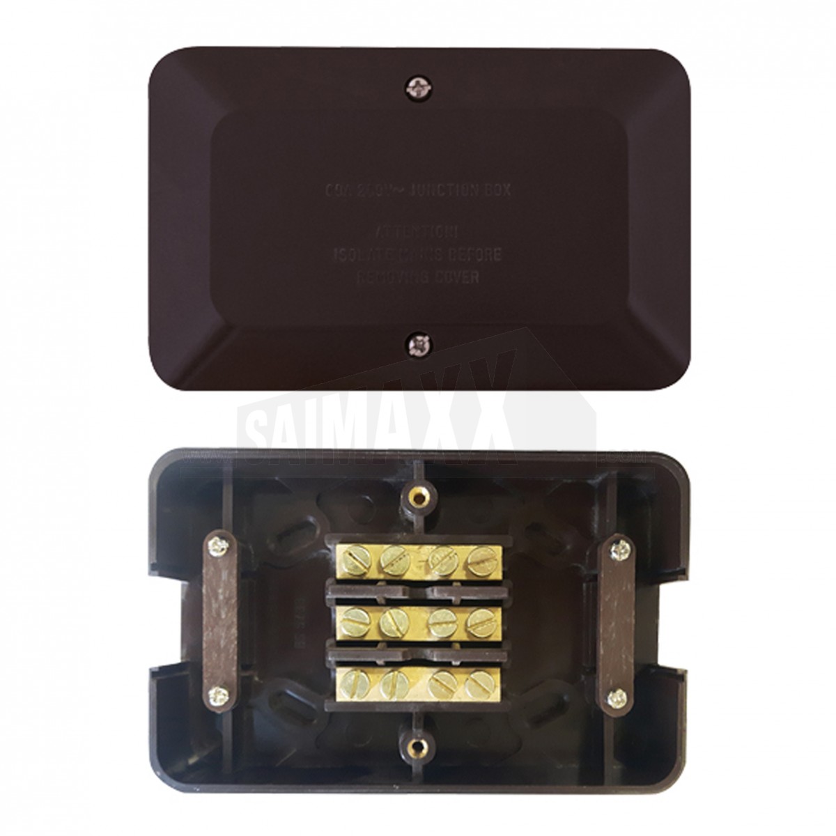 A 60 Amp brown rectangular junction box with 3 terminals provides a robust enclosed connection point for heavier duty fixed wiring. It is suited to higher current cable terminations where a rectangular box format is preferred.