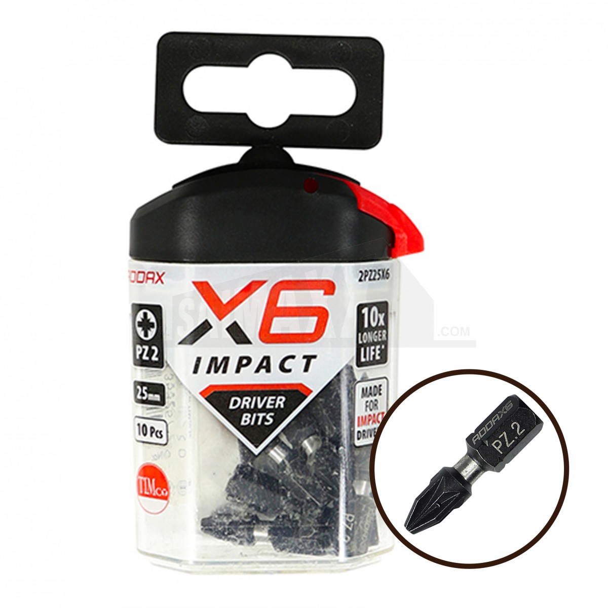 The Addax X6 Impact Duty Screwdriver Bits PZ2 25mm 10pc are Pozi No.2 impact-rated bits for driving screws with compatible power tools and impact drivers. They provide a secure fit in PZ2 screw heads and are suited to repeated fixing work.
