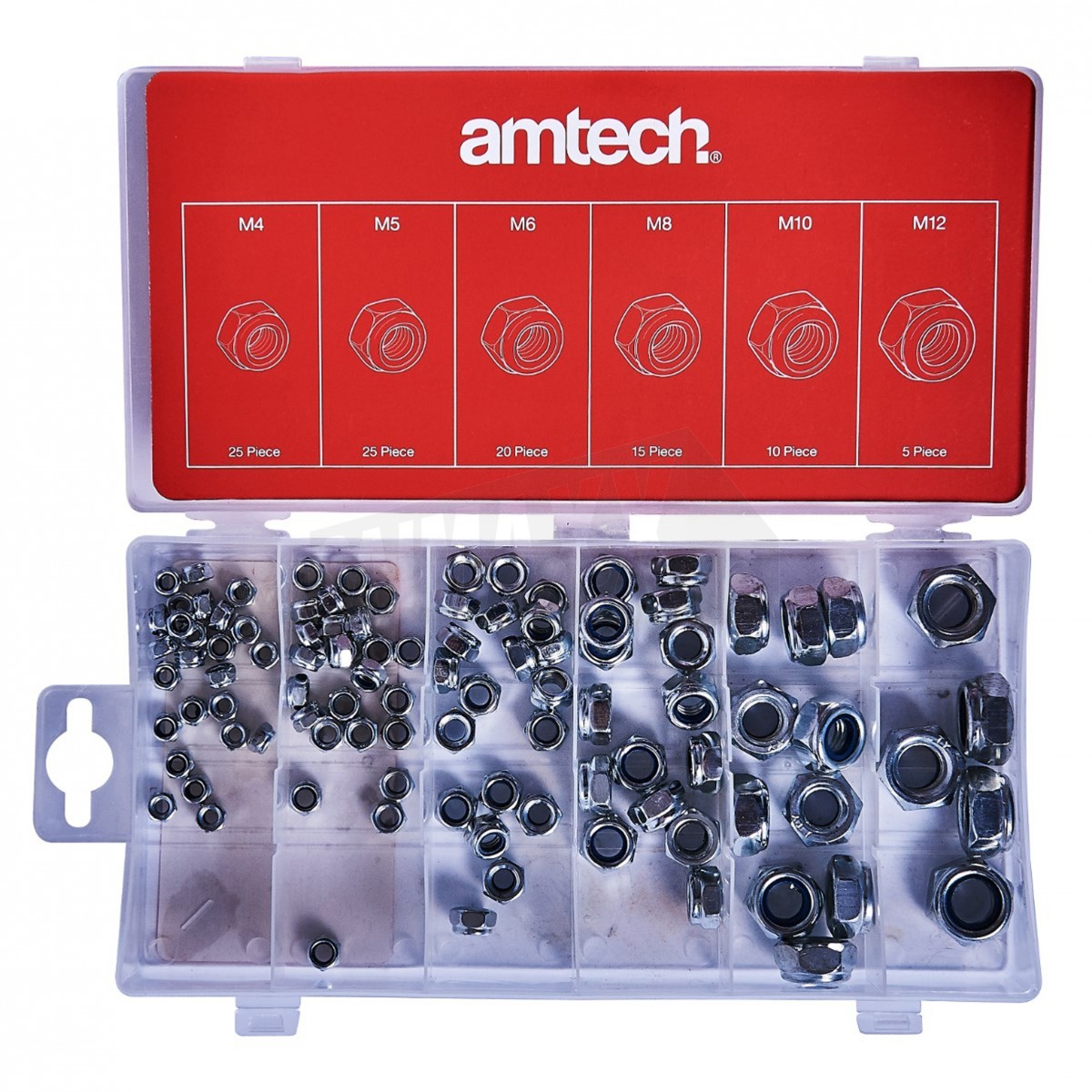 The Amtech 100pc Locking Nut Assortment Set includes assorted locking nuts for more secure fastening in assemblies subject to movement or vibration. It is useful for repair, maintenance and replacement work where a firm hold is needed.