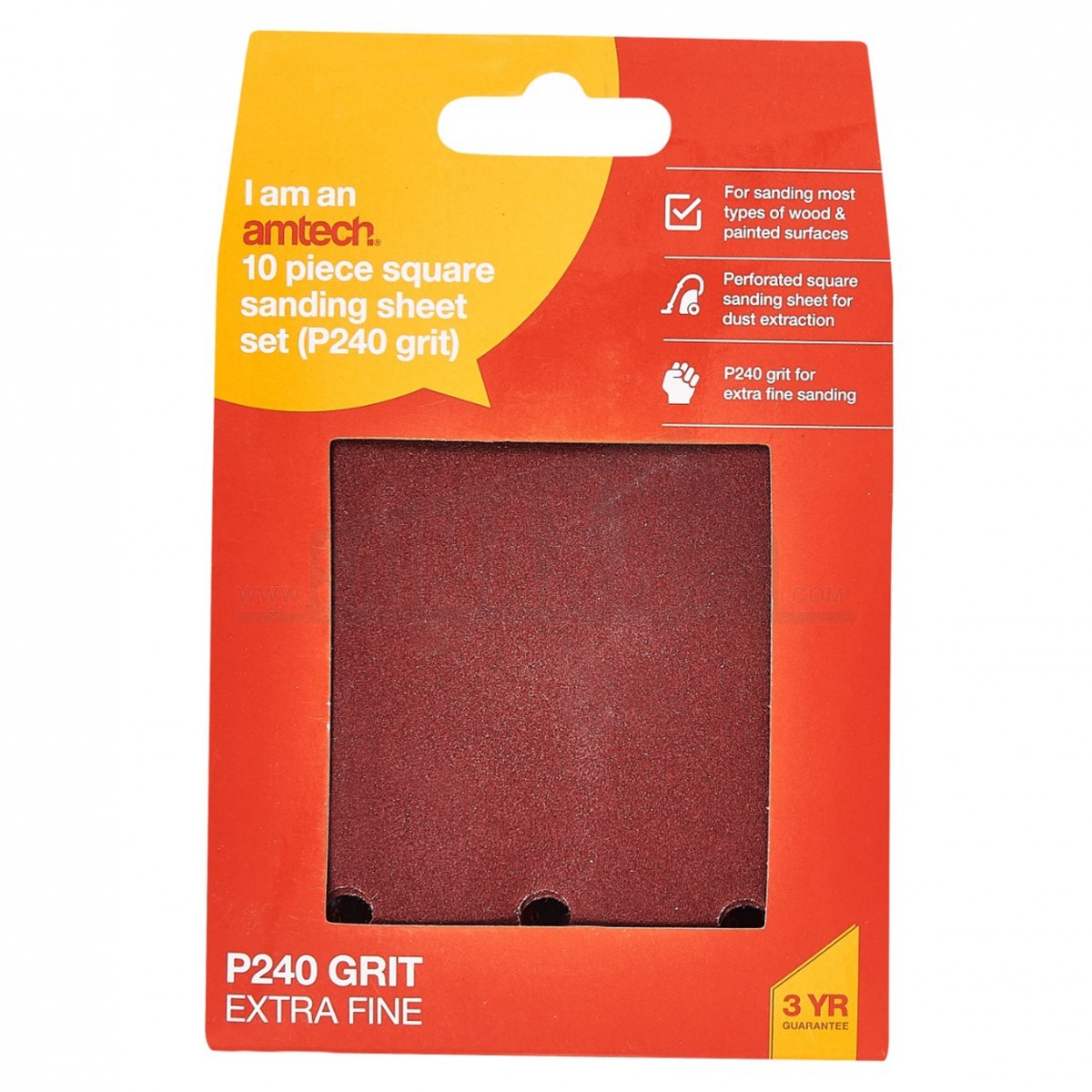 The Amtech 10pc Square Sanding Sheet Set Pack P240 Extra Fine includes 10 extra fine square sanding sheets for light finishing and surface smoothing. It is suited to fine preparation work between coats or before final finishing.