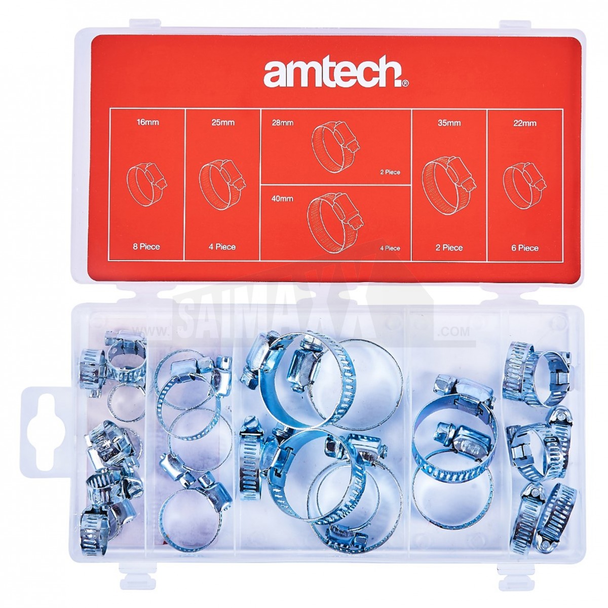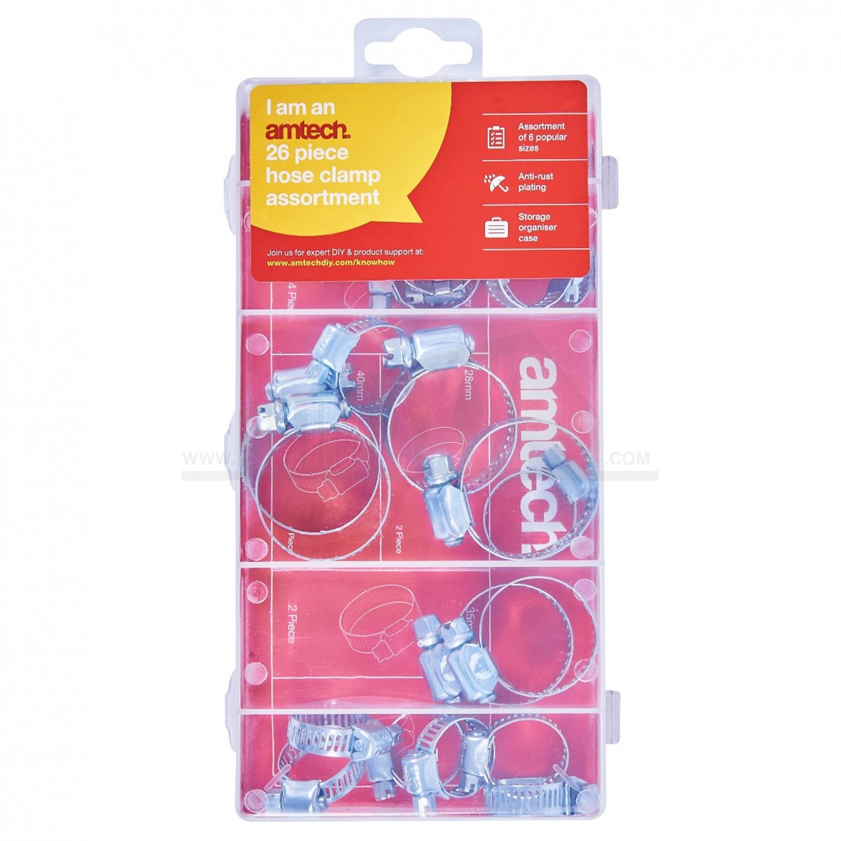 The Amtech 26pc Hose Clamp Assortment Set provides a selection of hose clips for securing flexible hoses and tubing. It is suitable for workshop, automotive and light plumbing maintenance jobs.