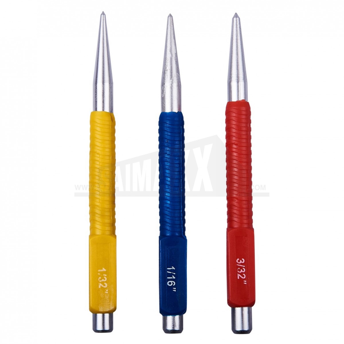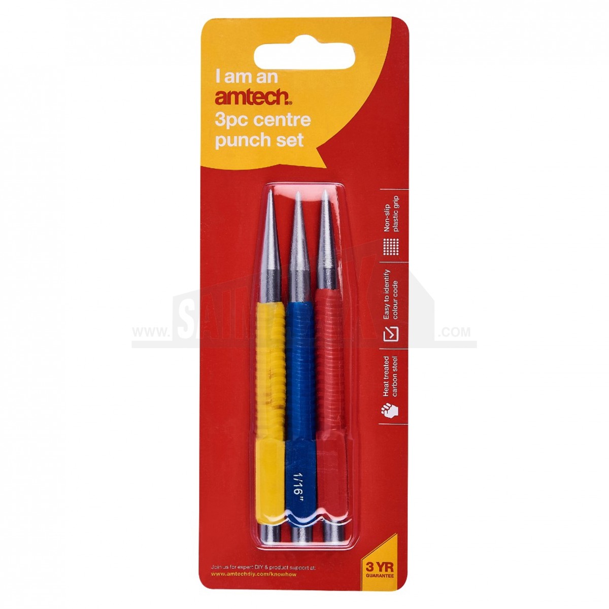 The Amtech 3pc Centre Punch Set is a three-piece multi-coloured set for marking accurate starting points before drilling. It helps prevent drill bits from wandering on metal and other hard surfaces.