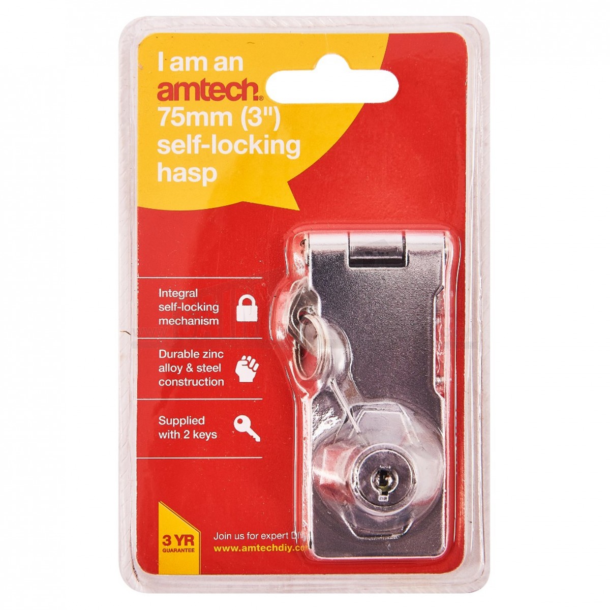 The Amtech 75mm (3") Self Locking Hasp is a compact security fastening for doors, gates and boxes. It locks automatically when closed to help keep items secured with a padlock.