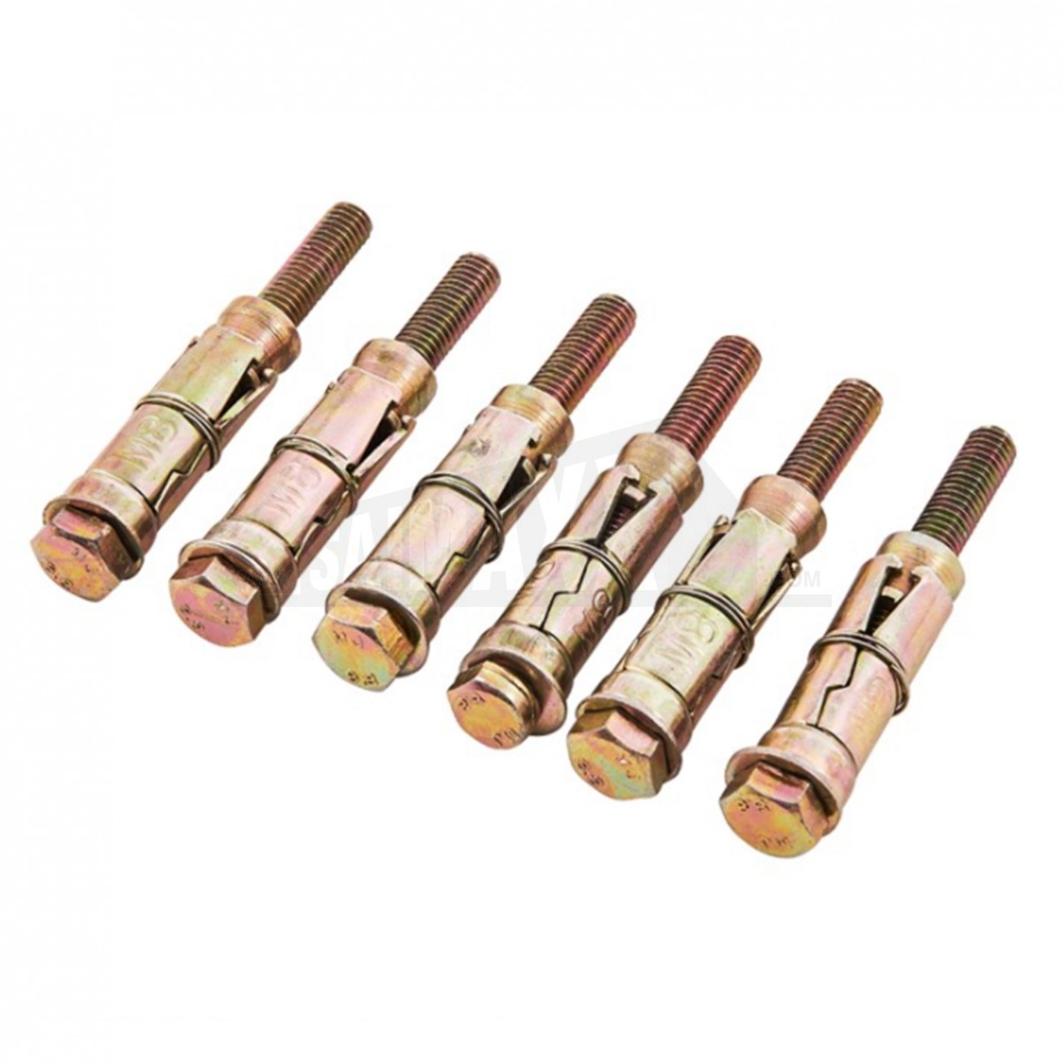 The Amtech M8 x 75mm Expansion Bolts 6pc Pack is a set of heavy-duty anchor bolts for securing fittings into concrete, brick and other solid masonry. It provides an expanding fixing for firm fastening of brackets, frames and structural components.