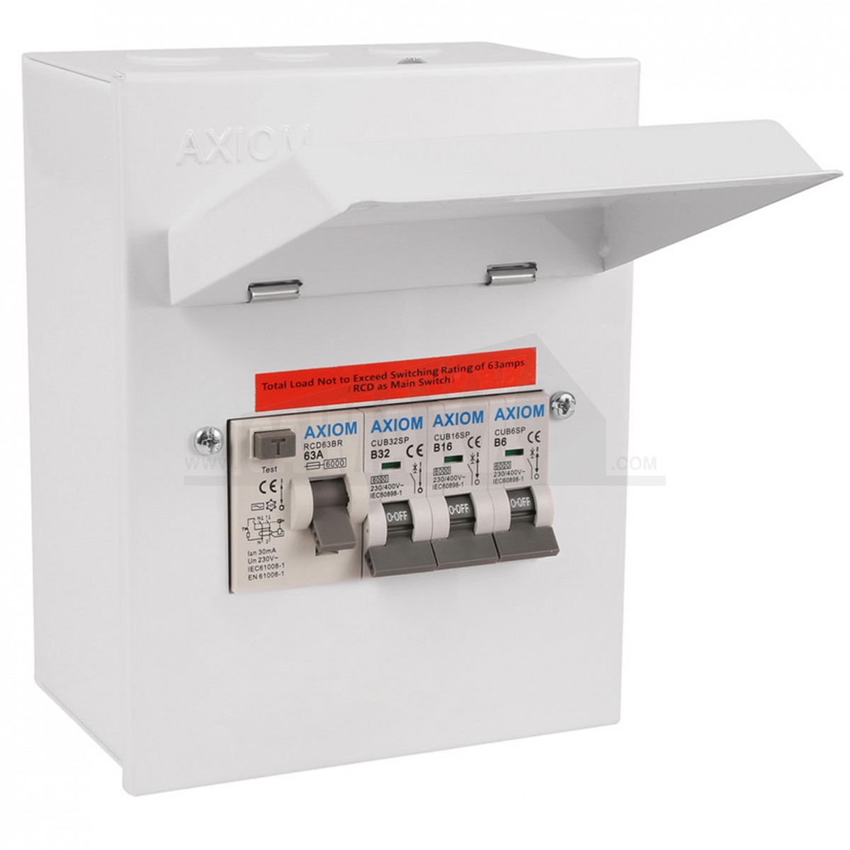 The Axiom 5 Way Garage Unit with 63A RCD and 6A, 16A & 32A MCBs is a compact consumer unit for garage and outbuilding electrical circuits. It provides RCD protection and multiple outgoing ways for lighting, socket and higher-load supplies.