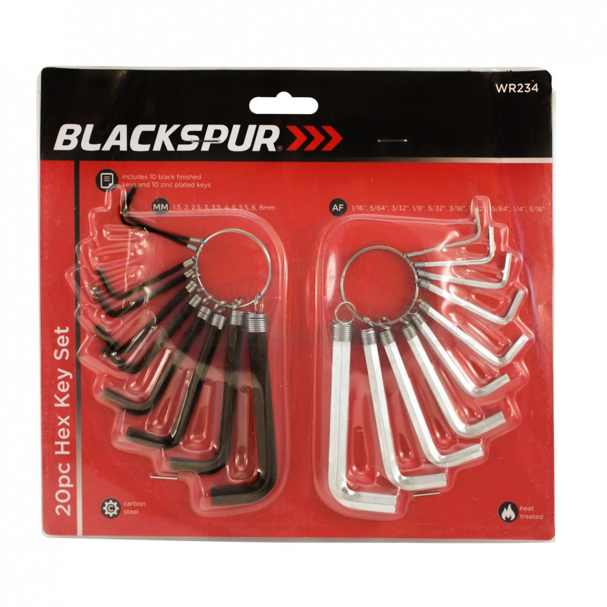 This hex key set comes with 10 black finished mm keys and 10 zinc plated Imperial (Inch) keys which are all manufactured from heat treated carbon steel.