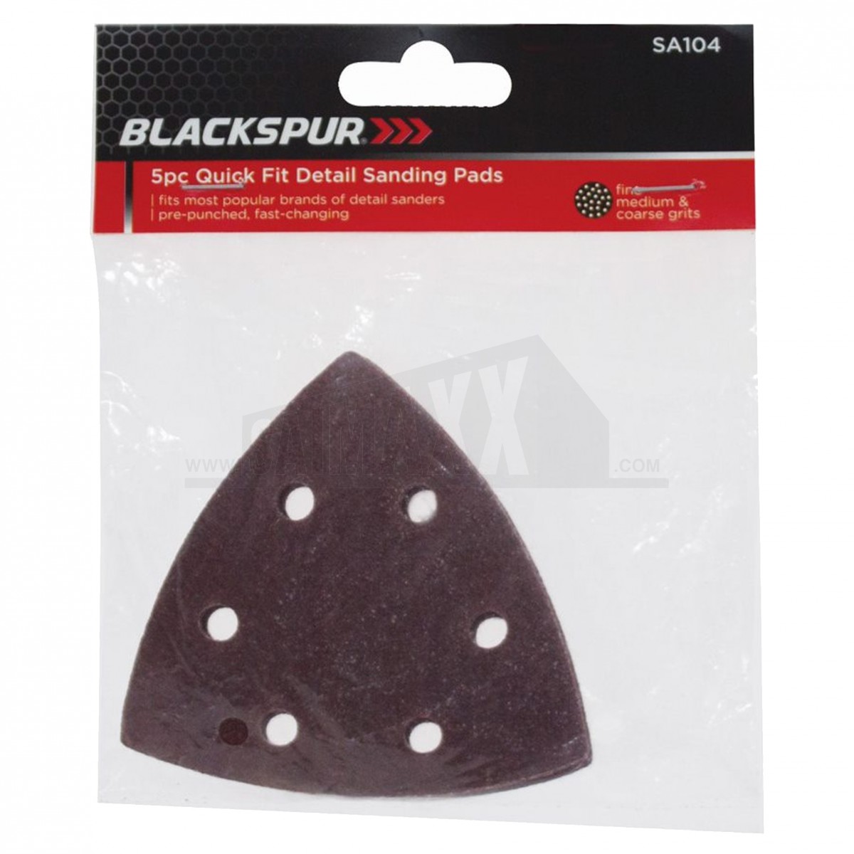 The Blackspur 5pc Quick Fit Detail Sanding Pad Set includes five triangular sanding pads for detail sanding in corners and tight areas. It is designed for quick-fit use on compatible sanding tools when working on wood, filler or painted surfaces.