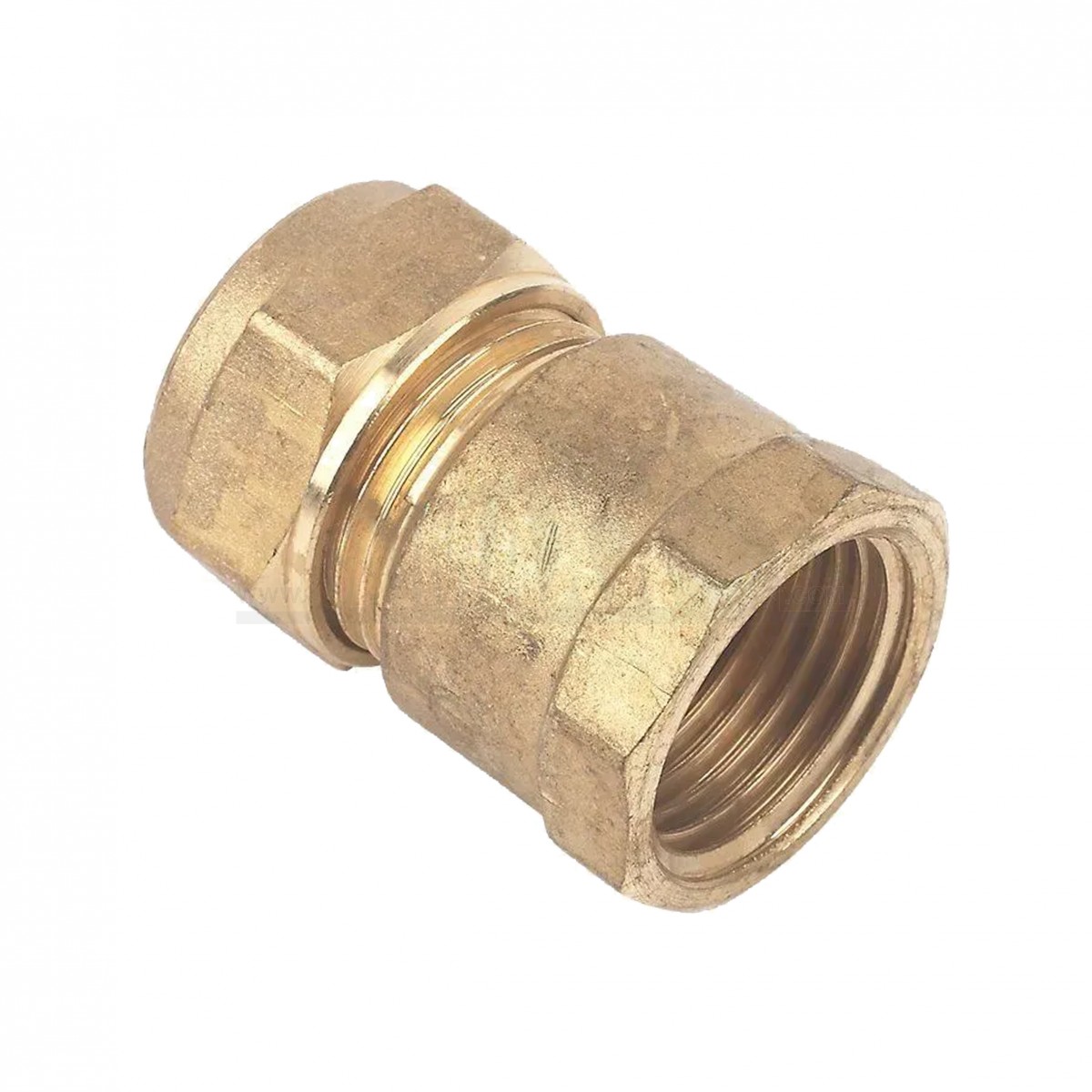 A Compression Brass Female Iron Coupling 15mm x 3/4" connects 15mm pipe to a 3/4 inch female threaded iron connection. It is used where compression pipework needs to join a male threaded fitting or valve.