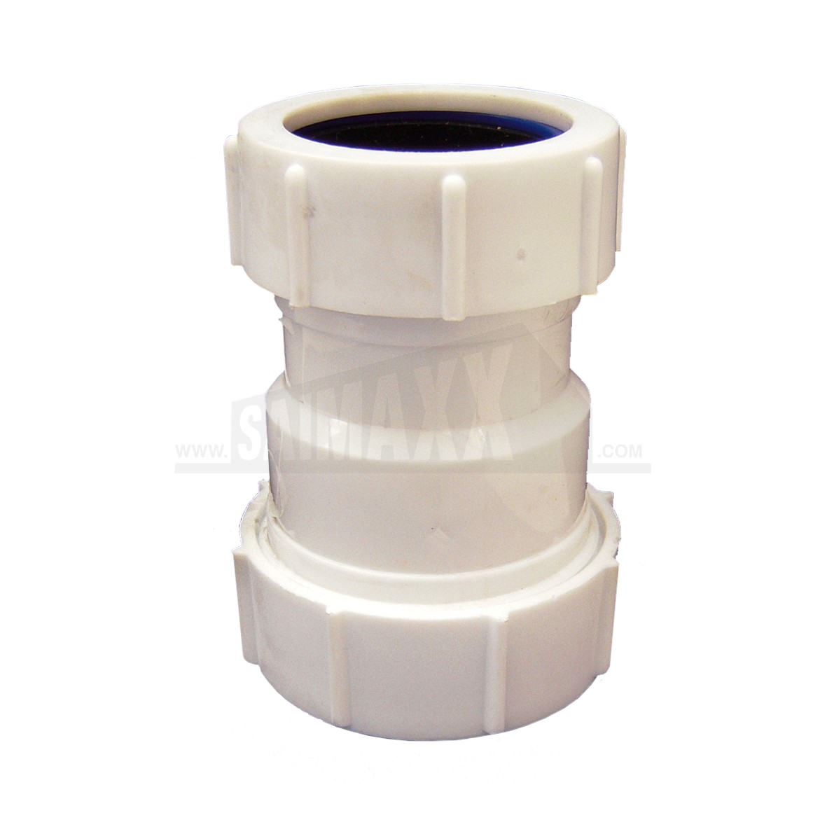 A Compression Waste Coupling Reducer White 1.5" x 1.25" is a reducing fitting for connecting 1.5 inch waste pipe to 1.25 inch waste pipe. It has compression nuts on both sides for a secure demountable joint in white plastic waste systems.