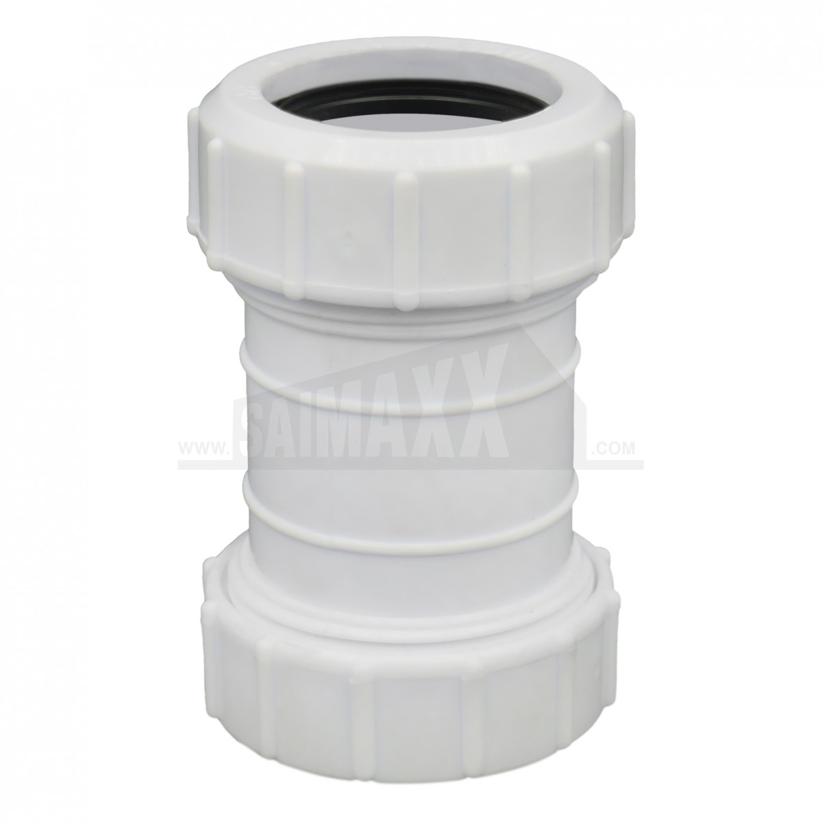 A white compression waste straight coupling for 32mm and 1.25 inch waste pipe. It joins two lengths of pipe in a straight run for waste drainage systems.