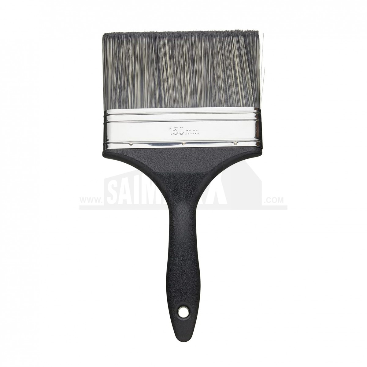 A traditional wall brush, made with a mixture of polyester and pure bristle for durability, on a black beaver tail-shaped plastic handle.