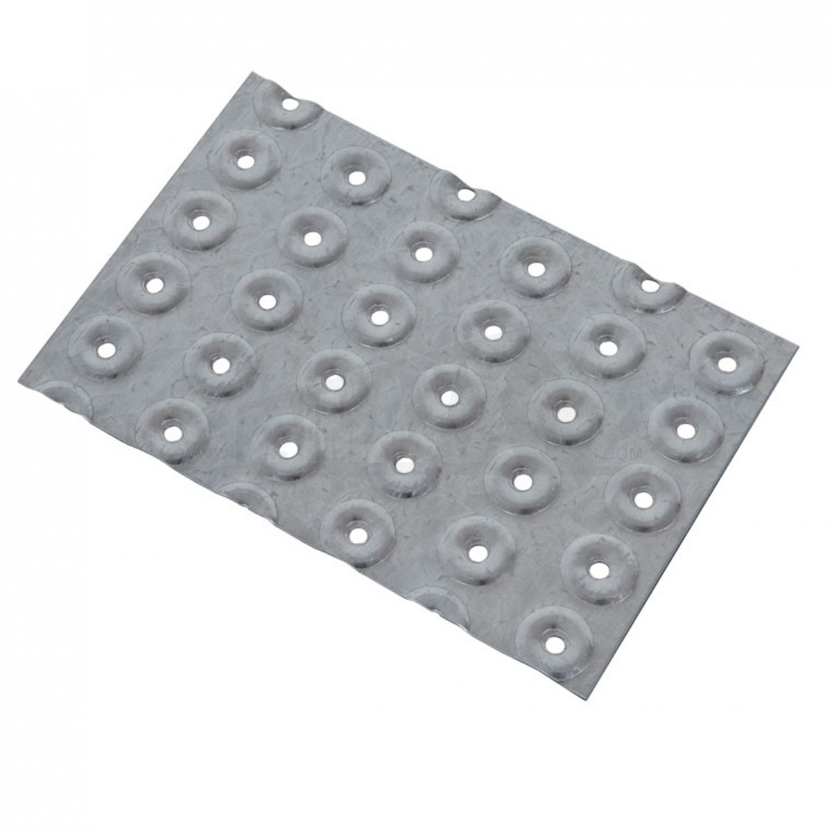 A galvanised nail plate measuring 100 x 150mm, punched with holes for joining and reinforcing timber sections. It provides a simple corrosion-resistant fixing for plated timber connections.
