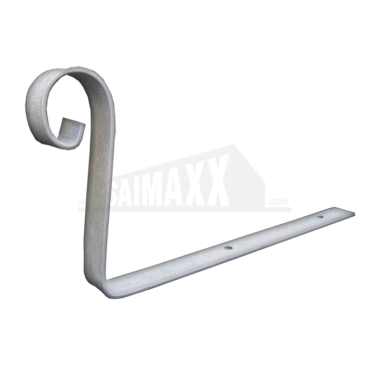 A steel retaining bracket with traditional scrolled style used to prevent ridge or hip tiles movement on hip roofs