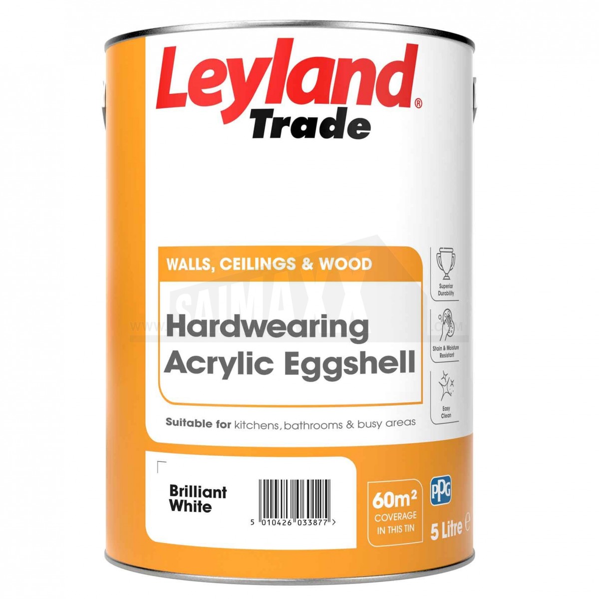 The Leyland Hardwearing Acrylic Eggshell Paint Brilliant White 5 Litre is a durable mid-sheen interior paint for walls, wood and metal. It provides a tough, wipeable finish suited to busy rooms and repeated cleaning.