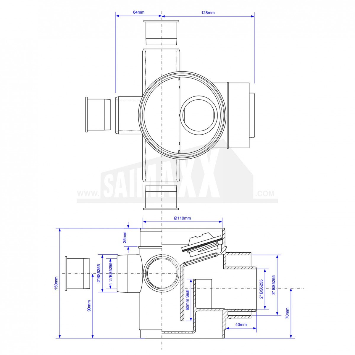 - Inlet connections are for solvent welding to 1½" ABS/PVC pipe, internal fit or 2" ABS/PVC pipe, external fit