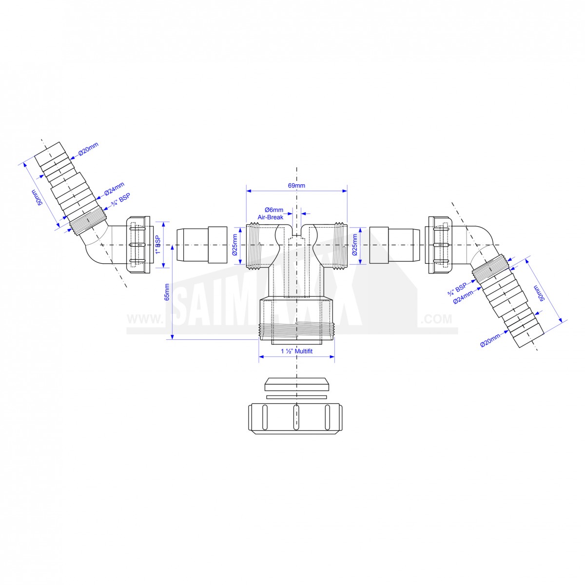 - Multifit Outlet to suit either 1½" or 40mmØ Standpipe, Supplied with Blanking Plugs