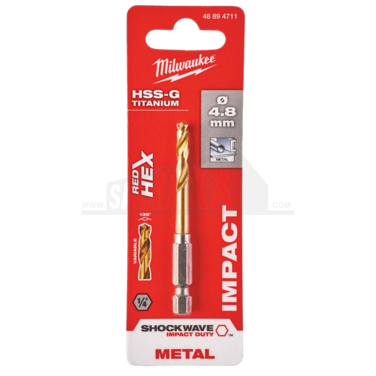 The Milwaukee Shockwave HSS-G Titanium Red Hex Drill Bit 4.8mm is a high speed steel drill bit with a 1/4in hex shank for clean, accurate drilling in metal and other materials. It is suited to use with impact drivers and drill drivers where quick bit changes are needed.