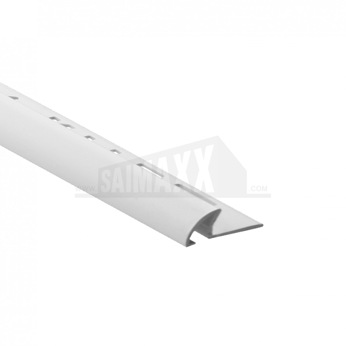 A plastic tile edging trim with a curved white finish, 9.5mm deep and 2.44m long, provides a neat protective edge to tiled surfaces. It helps cover exposed tile edges while giving a smooth rounded finish.