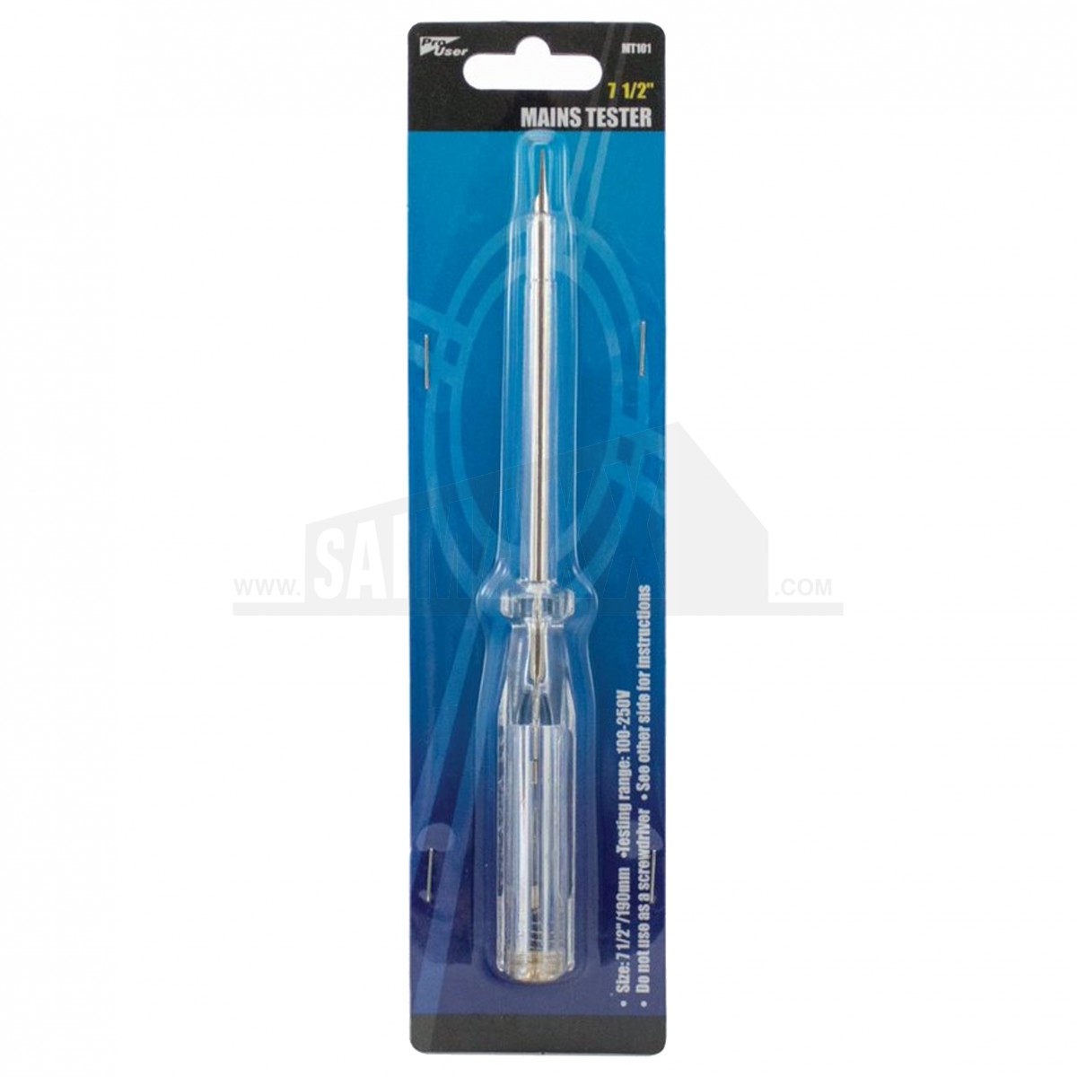 The Pro User 7.1/2in Mains Tester Screwdriver 100-250V is a compact voltage tester for checking live electrical circuits within the stated range. It combines a screwdriver form with a clear tester function for quick fault finding and basic electrical checks.