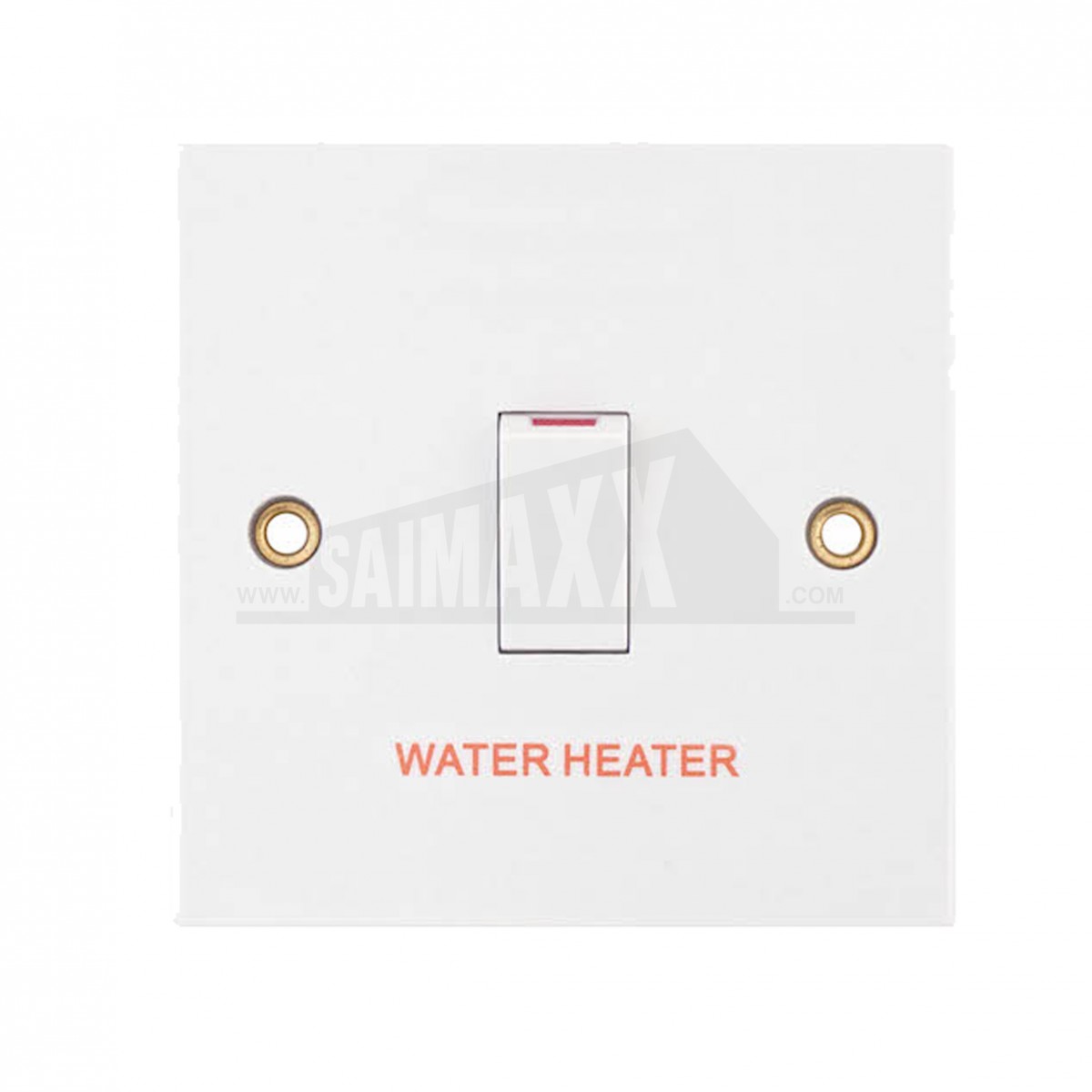 A Square Edge 20 amp DP switch labelled "HEATER" provides clearly identified double-pole isolation for dedicated heating appliances. It is suited to installations where no neon indicator is required.