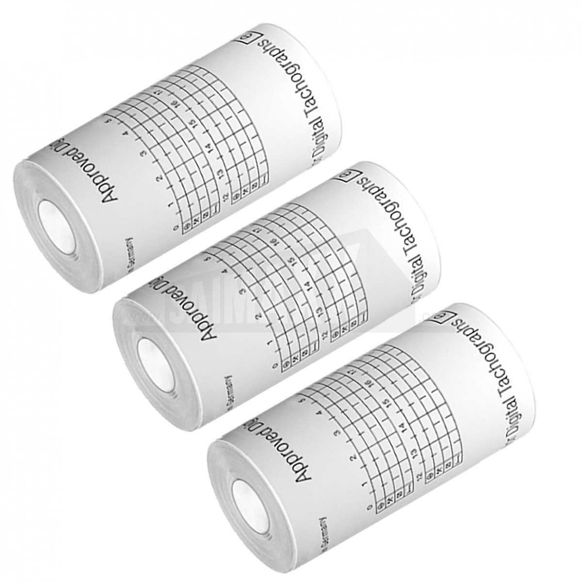 A thermal roll for digital tachographs measuring 57mm x 26mm diameter is supplied as an 8m coreless roll in a box of 3. It is made for printing tachograph records and driver activity data.