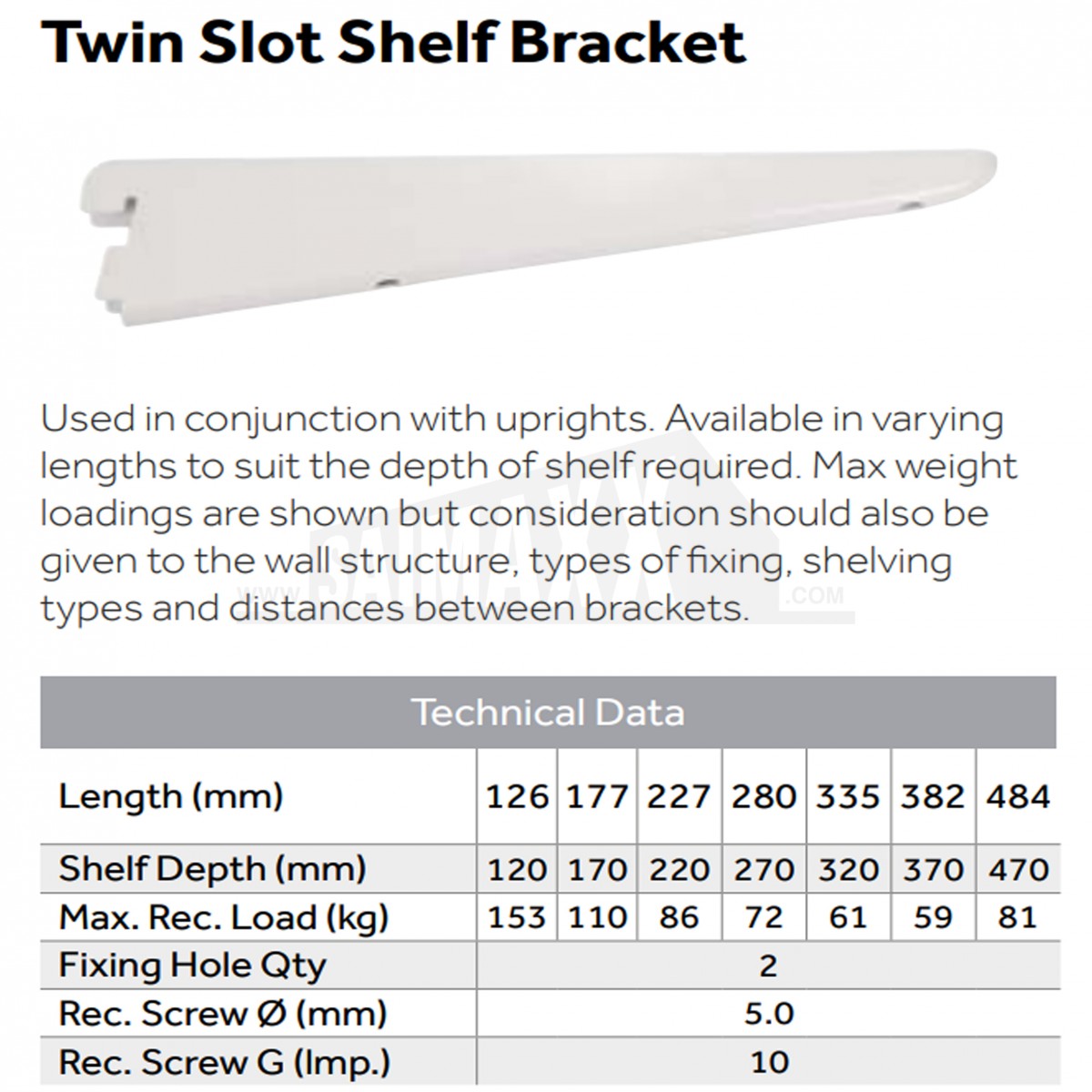 The Timco Twin Slot Shelving White Bracket is a 370mm support bracket for use with twin slot uprights in adjustable wall shelving systems. It provides a secure platform for shelving in storage, utility and retail areas.